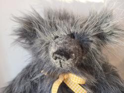 Coucou, je m'appelle Trévor. Je suis un bon gros ours de 38 cm réalisé en fausse fourrure grise à poils longs. Mes dessous de pattes sont en suédine jaune.