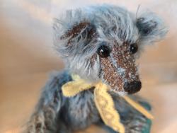 Bonjour. je m'appelle Pablo. Je suis un tout petit ours de 15,5 cm réalisé en Schulte mohair clairsemé. Mes dessous de pattes sont en suédine bleue. J'ai hâte de vous rencontrer.