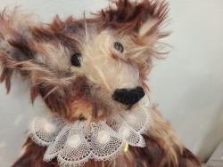 Bonjour. Je me prénomme Amédée. Je suis un très gentil ours de 29 cm réalisé en Schulte mohair méché brun à poils longs et suédine. J'ai mis une très jolie collerette de dentelle.