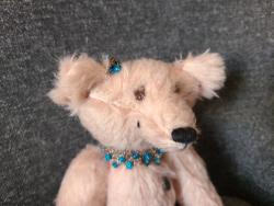 Enchantée de vous rencontrer. Je me prénomme Priscille, je suis une belle ourse de 28 cm réalisée en Schulte mohair à poils courts. Très élégante, j'ai assorti mon collier et mon bracelet à la petite décoration sur ma tête.