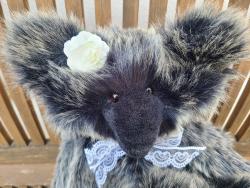 Bonjour. Nous sommes deux ourses de 44 et 27 cm réalisées dans une magnifique fausse fourrure méchée très douce. Moi, Berthine, la maman, je porte une fleur devant mon oreille et Claudine, ma fille, une couche-culotte, elle est encore si jeune... Nous souhaitons être adoptées ensemble, une séparation serait trop cruelle...