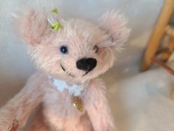 Bien le bonjour, je me prénomme Arletta. je suis une petite ourse de 15,5 cm réalisée en Schulte mohair rose pâle. J'ai de beaux yeux bleus et je suis très coquette.