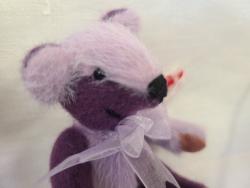 Coucou, je m'appelle Billy. Je suis un tout petit ours de 11,5 cm réalisé en smokey long pile violet et mauve et suédine.