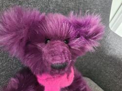 Bien le bonjour. Je m'appelle Rodolphe. je suis un ours de 32 cm réalisé dans une superbe et épaisse fausse fourrure violette à poils longs. Je suis prudent, j'ai mis ma petite écharpe.