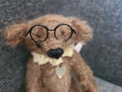 Bonjour les amis. Moi, c'est Raymond. Je suis un tout petit ours de 15 cm réalisé en Schulte mohair clairsemé. Je porte des lunettes et une collerette en dentelle.