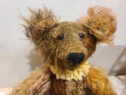 Bien le bonjour. Je me prénomme Armand. je suis un bel ours de 19 cm réalisé en Schulte mohair de plusieurs couleurs de brun. Le dessous de mes pattes est en suédine, et je porte une jolie collerette de dentelle ancienne.