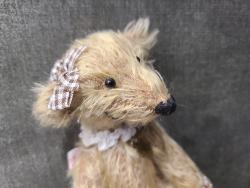 Bien le bonjour. Je m'appelle Cathy, je suis une ourse de 16 cm réalisée en Schulte mohair beige clairsemé et suédine jaune. J'ai une petite collerette, un noeud devant mon oreille et un bracelet.