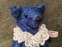 Coucou, je m'appelle Gustave. Je suis réalisé en Schulte mohair bleu et suédine. je mesure 15 cm et j'ai mis une belle collerette.