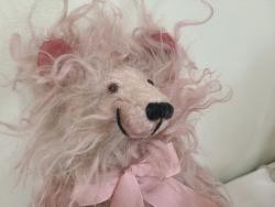 Bonjour, moi, c'est Aristide, et vous? Je suis un bel ours de 30 cm réalisé en Schulte mohair rose à poils longs et bouclés et suédine rose sous mes pattes.