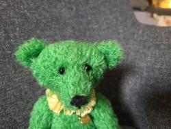 Coucou, je m'appelle Brocoli. Je suis un très gentil ours de 25 cm réalisé en Schulte mohair vert vif à poils courts et suédine jaune. je n'ai pas oublié de mettre ma petite collerette de dentelle.