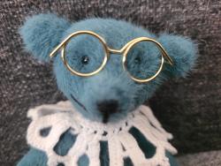 Bonjour, bonjour. Je m'appelle Anicet. Je suis un tout petit ours de 12 cm réalisé en smokey long pile. Je porte des lunettes dorées et une belle collerette.