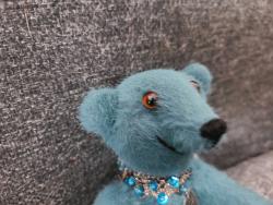 Coucou, les amis. Je m'appelle Aubin, je suis un petit ours de 15 cm réalisé, comme mon frère Anicet, en smokey long pile vert. J'ai des yeux couleur d'ambre et un magnifique ruban comme collier ras du cou.